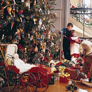 Biltmore's second floor living hall features a children's tree adorned with beaded garlands and toy ornaments.